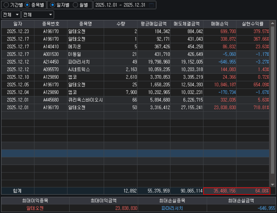 특이사항은 없었던 것 같고 12월 1일에 매도한 알테오젠 평균매입금액이 놀라울뿐 ㅋㅋㅋㅋㅋㅋ