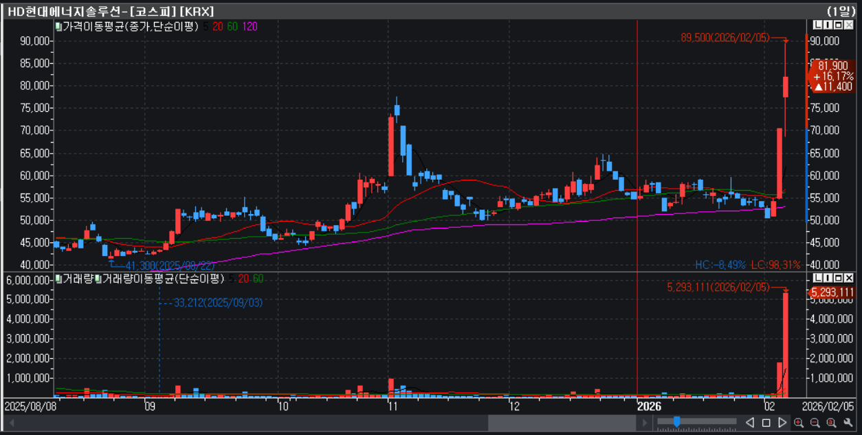 우선 HD현대에너지솔루션의 일봉이다. 거의 상한가까지 갔었고 16% 정도 올라서 마감했으니 괜찮은 흐름이지만...